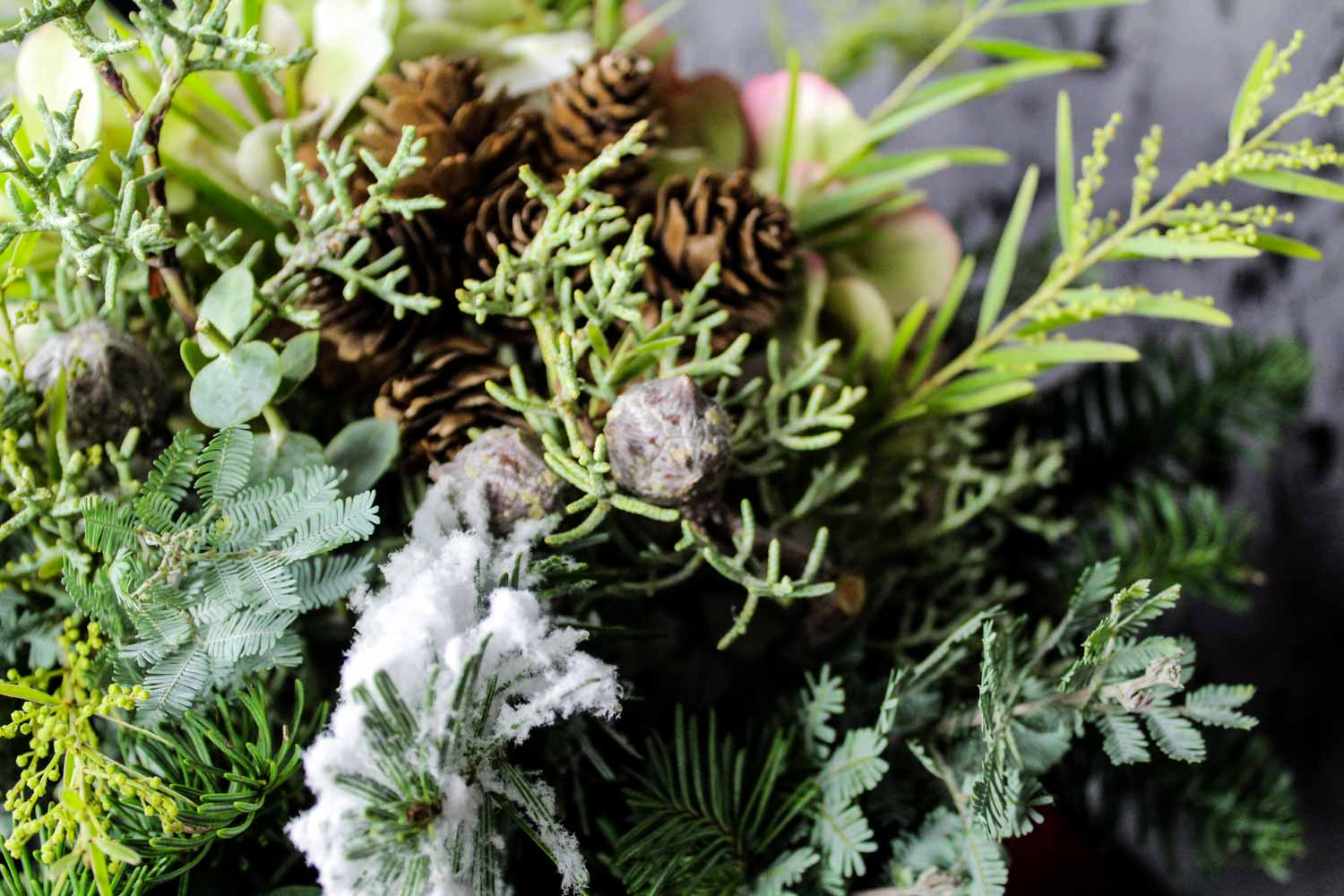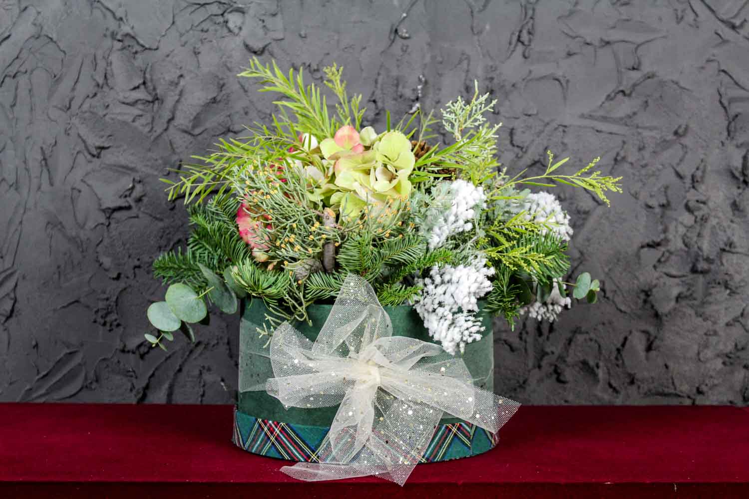 Composizione di fiori creata in un elegante contenitore di cartone vellutato e finemente decorato. Una composizione floreale, in questo caso, composta da un’ortensia, pigne naturali e una combinazione di verdi di complemento tra cui eucalipto e pino argentato floccato. Il fresco profumo che accompagna questa composizione ornamentale saprà donare delicatezza e originalità ad ogni angolo della casa. Ideale da regalare in qualsiasi occasione, compleanno, anniversario di matrimonio, per un ringraziamento o in occasione di un matrimonio. Ogni cofanetto ha la caratteristica dell’unicità e dell’esclusività che accomuna l’arte del packaging con l’arte dei fiori, proprio per questo i fiori usati possono variare in base alla stagione in cui viene scelto e composto.